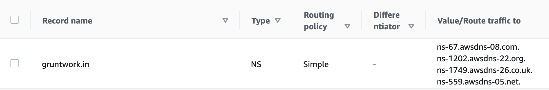 on Windows. For example, the hosted zone configuration for the gruntwork.in domain used by Gruntwork for testing looks like this in Route 53: